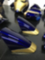 As for paint, we wanted this armor to "pop". We took the "hot rod paint job" seriously and went with a custom mixed three-stage Candy Paint from House of Kolor. This blue-purple paint consists of a ground coat, then several layers of candy coat (pearlescent and metal flake) and finally the 2k clear coat. We applied this as you would a car: we set up a paint booth in our garage and sprayed with a HVLP gravity-feed spray gun and air compressor.